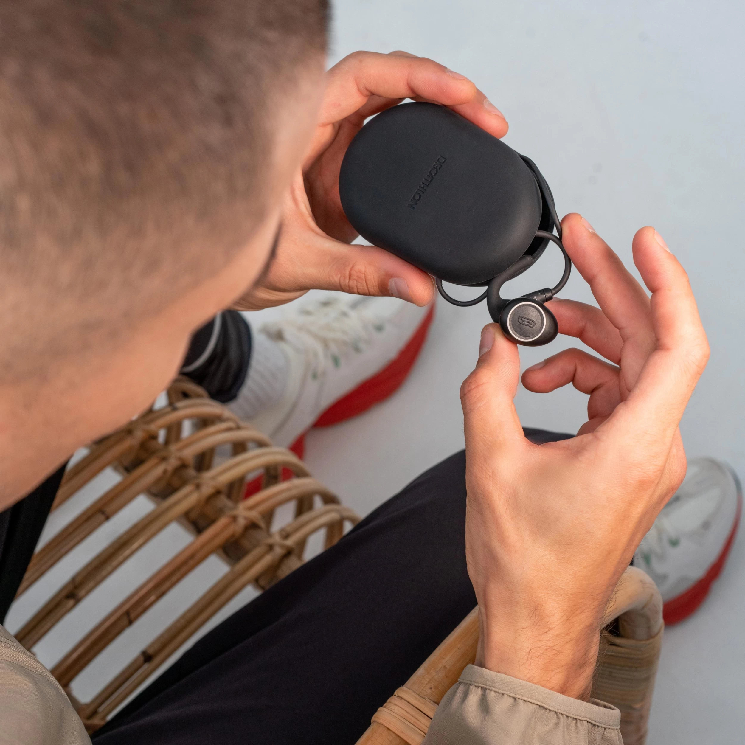 when you run, your whole body moves. Your earphones need to be perfectly stable in your ears. You sweat when you run, so your earphones need to be resistant to perspiration. And you need to keep a good perception of outside noises. These three different requirements guided us throughout the design of the KALENJI 900 sports earphones.